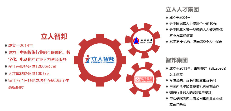 立人智邦成立于2014年,是由立人人才集團(tuán)與智邦人力集團(tuán)強(qiáng)強(qiáng)聯(lián)手共同組建,這兩家公司在業(yè)內(nèi)都具有十余年獵頭經(jīng)驗(yàn)的著名獵頭公司。立人人才集團(tuán)成立于2004年,是中國(guó)民營(yíng)人力資源企業(yè)前10強(qiáng),也是中國(guó)北區(qū)第一規(guī)模的人力資源整體解決方案提供商。立人人才集團(tuán)擁有30家分支機(jī)構(gòu),遍布200個(gè)大中城市。立人人才集團(tuán)組織架構(gòu)為事業(yè)部制,外包事業(yè)部、獵頭事業(yè)部(立人智邦)、管理咨詢(xún)事業(yè)部、互聯(lián)網(wǎng)+事業(yè)部。智邦集團(tuán)成立于2013年,由郭蓬紅(Elizabeth)女士創(chuàng)立,在創(chuàng)業(yè)初期以專(zhuān)注互聯(lián)網(wǎng)投資和互聯(lián)網(wǎng)被投企業(yè)提供人才服務(wù)為主線,同時(shí) 探索二三級(jí)城市傳統(tǒng)行業(yè)為輔線。智邦集團(tuán)與國(guó)內(nèi)眾多知名投資機(jī)構(gòu)長(zhǎng)期合作,擁有行業(yè)強(qiáng)大的B端客戶(hù)資源。目前已與眾多家國(guó)內(nèi)上市公司和創(chuàng)業(yè) 企業(yè)建立合作關(guān)系,并成就了優(yōu)秀人才的職業(yè)發(fā)展。